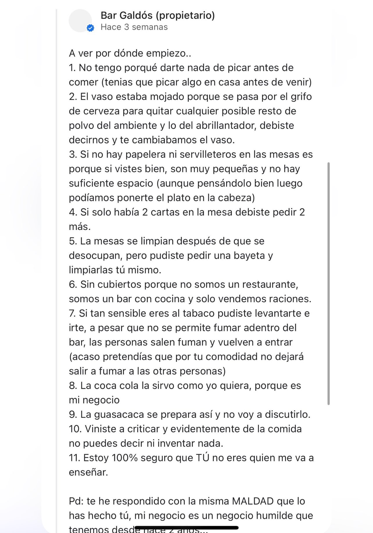 Los dueños del bar no se han quedado callados, y han respondido punto por punto a la lista del cliente indignado. Al final, acaba con una frase demoledora: “He respondido con la misma maldad que lo has hecho tú”. El intercambio se ha hecho viral, y muchos celebran la respuesta como una victoria de los trabajadores de la hostelería frente al juicio constante.