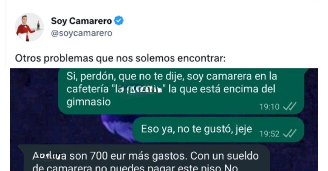 La mujer, que es madre soltera y tiene un contrato indefinido desde marzo, se encontró con la sorpresa de que el casero le aconsejó buscar un piso más pequeño y le cuestionó su capacidad económica por el hecho de trabajar en la hostelería. La conversación se hizo viral después de que la popular cuenta de Twitter @soycamarero la compartiera con sus más de 200.000 seguidores.