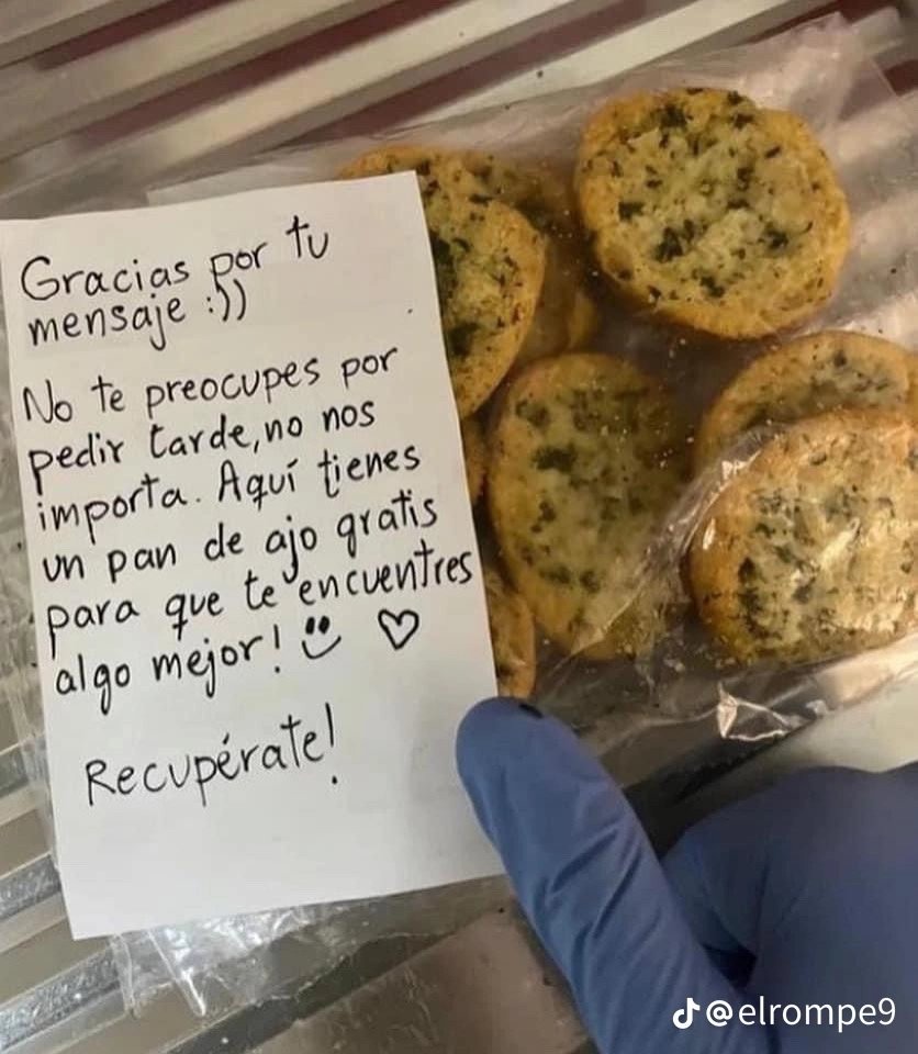 El negocio, lejos de cancelar el pedido, le envió la comida junto con un pan de ajo gratis y una nota emotiva que decía: “Gracias por tu mensaje. No te preocupes por pedir tarde, no nos importa. Aquí tienes un pan de ajo gratis para que te encuentres algo mejor. ¡Recupérate!”
