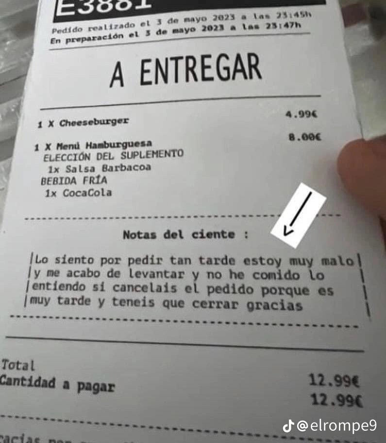 En esta ocasión, ha llamado la atención de las redes sociales la historia de un hombre que pidió comida a domicilio a través de una plataforma online se llevó una sorpresa al recibir su pedido. El cliente había dejado una nota en su solicitud diciendo que se encontraba muy malo y que lo sentía por pedir tan tarde, y que entendía si cancelaban el pedido porque era muy tarde y tenían que cerrar.