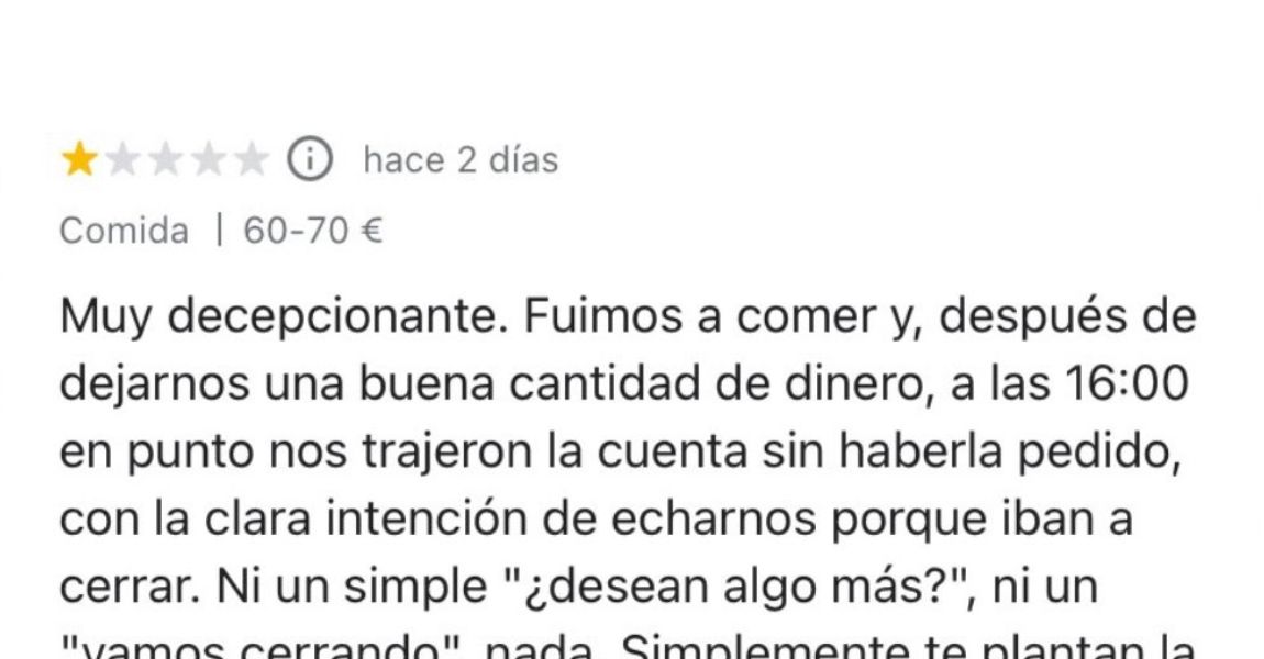 «Muy decepcionante. Fuimos a comer y, después de dejarnos una buena cantidad de dinero, a las 16:00 en punto nos trajeron la cuenta sin haberla pedido, con la clara intención de echarnos porque iban a cerrar», escribió el cliente en la reseña, calificando el local con una sola estrella.